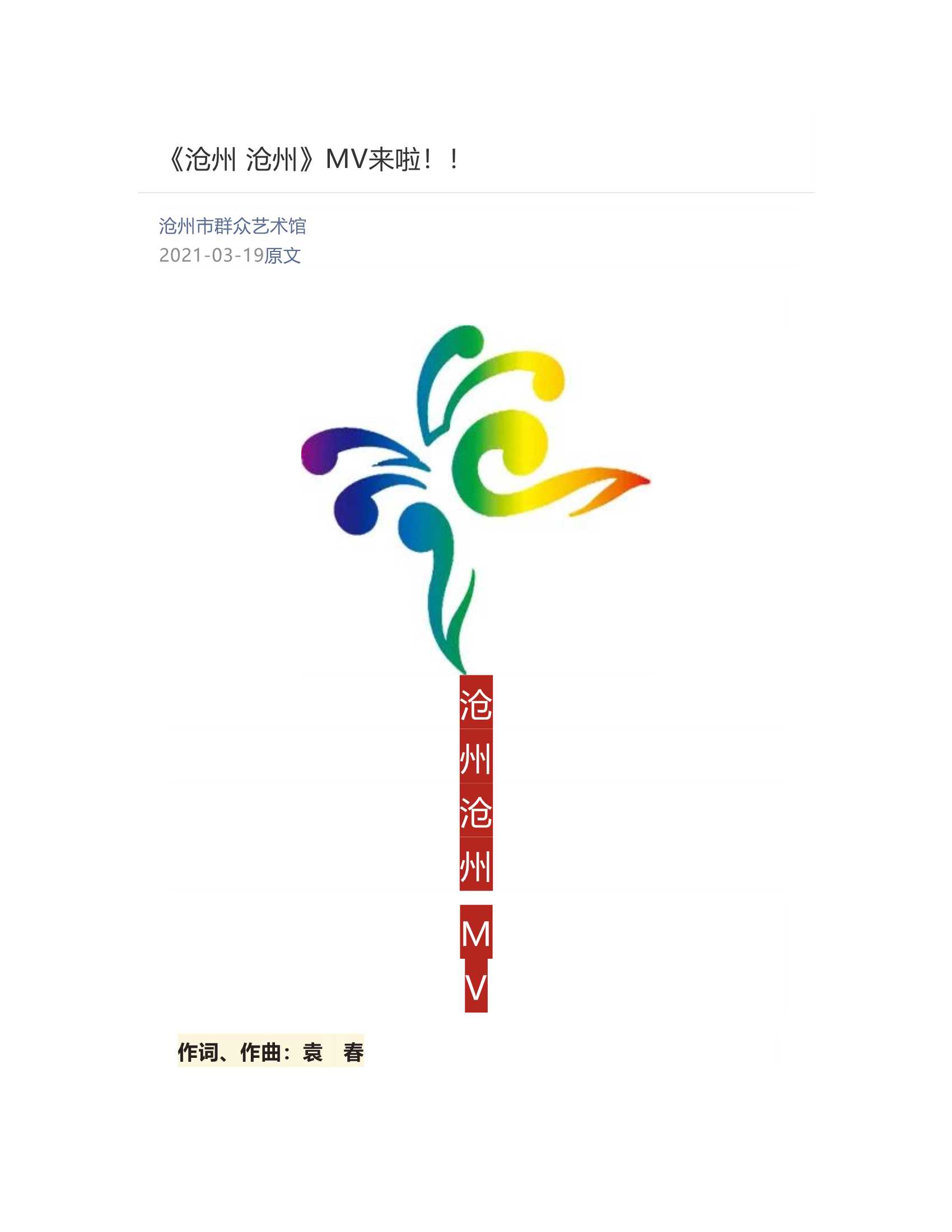 2021-03-19 《沧州 沧州》MV来啦!!